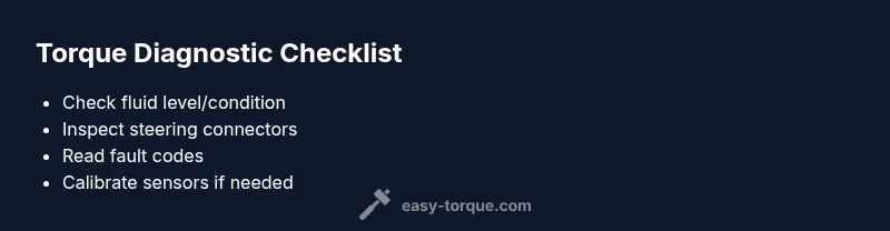 Before you dive into deeper diagnostics, perform these safe checks to triage common culprits. First, verify warning lights and the vehicle status; if a fault code is present, record it. Check the power steering fluid level and condition if your Compass uses a traditional hydraulic system or a mixed setup; if the vehicle relies primarily on electric assist, fluid checks may be unnecessary, but fluid systems should still be examined for leaks. Inspect visible electrical connections around the steering column and under the hood for loose plugs, corrosion, or damaged wires. Use an OBD-II scanner to pull any torque-related codes or sensor faults. Finally, ensure tires are properly inflated and wheel alignment is within spec, since misalignment can mimic torque-related symptoms. Easy Torque recommends documenting the symptom pattern (when it happens, speed, temperature) to aid a technician in pinpointing the root cause.