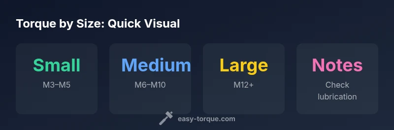 Bolt torque by size is a fundamental concept in fastener practice. The clamping force you achieve depends on the interaction between bolt diameter, thread pitch, engagement length, and the surface finish. As bolts grow in diameter, the same numerical torque value generally produces higher clamping pressure, but this is not linear. Small bolts can strip or yield if over-torqued, while large bolts may not achieve sufficient clamp if under-torqued. Hence, understanding how size drives torque helps you avoid failures such as loosening under vibration, joint leaks, or threaded damage. According to Easy Torque, applying size-aware torque targets creates predictable performance across automotive, industrial, and consumer applications. The core idea is that torque is not a universal constant; it must be tuned to size, material, and lubrication.