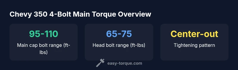 For chevy 350 4 bolt main torque specs, there is no universal value; the correct numbers vary by year, block revision, and fastener type. In general, main cap bolts on a 4-bolt SBC fall in a mid-range of about 95-110 ft-lbs, with an outer sequence tightening to maintain even clamping. Always consult the GM service manual or a trusted source for your exact engine and fastener grade.