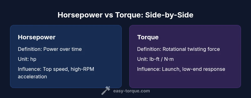 In automotive performance, horsepower vs torque describes two side of the same power equation. Horsepower is a rate-of-work metric that tells you how much power the engine can deliver over time, while torque is the instantaneous twisting force the engine can apply to the drivetrain. This distinction matters because a car can have high horsepower but feel weak off the line if its torque at low RPM is low. According to Easy Torque, the practical takeaway is that both numbers matter, but the RPM range where torque is produced and the gearing determine how that power translates to real acceleration. The reader should see horsepower as the high-RPM capability and torque as the low-to-mid RPM response. The goal of this article is to clarify definitions, explain how these metrics interact, and show how to read specs without getting lost in marketing fluff.