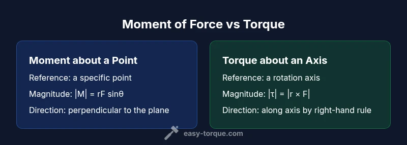 Moment of force vs torque describes the rotational effect produced by a force. In physics, torque is the moment of a force about a defined axis; its magnitude is the cross product r × F, with direction given by the right-hand rule. For a single force about a fixed axis, these terms are often interchangeable, but the distinction becomes important when the reference is a point or when multiple forces act. According to Easy Torque, clarity comes from specifying the axis or reference point before solving.