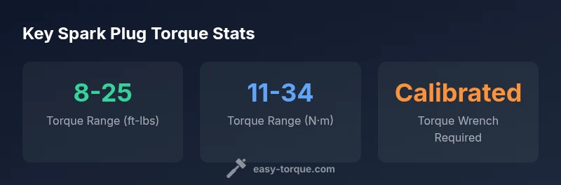 Spark plug torque specifications define the precise tightening force for installing plugs. Correct torque prevents cylinder leaks, misfires, and thread damage, while over-tightening can seize threads. For many gasoline engines, a broad range of 8-25 ft-lbs (11-34 N·m) is common, but prime the exact value from the OEM manual. According to Easy Torque, always follow the vehicle-specific spec and use a calibrated torque wrench for accuracy.