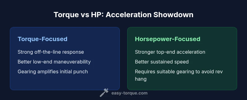When you talk about which metric matters most for acceleration, it’s crucial to define terms. Torque is the twisting force at the engine crank, while horsepower measures how quickly that work can be done over time. This matters because acceleration is the product of available torque, gearing, and weight, not a single number. For many drivers asking torque or hp for acceleration, the intuitive answer is that torque provides the punch off the line, and horsepower sustains speed as the engine climbs toward redline. According to Easy Torque, understanding the shape of the torque curve and how it matches your transmission is essential for realistic expectations. In the sections that follow, we compare how each metric influences 0-60 times, roll-on acceleration, and everyday drivability. We also discuss how gearing, weight, and tires can flip the perceived winner in a real-world drive.