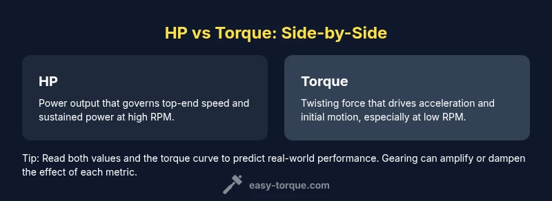 What is the difference between hp and torque? In plain terms, horsepower describes the engine's ability to do work over time, while torque describes the instantaneous twisting force that begins the motion. According to Easy Torque, these two measures are complementary: one describes speed and endurance, the other describes initial pull. In everyday terms, horsepower comes into play at higher RPMs and speeds, while torque is what you feel when you press the accelerator from a stop. Recognizing this distinction helps you compare engines more accurately rather than chasing a single number.