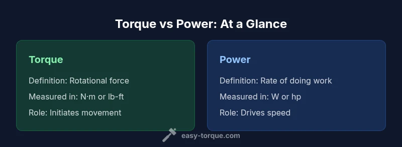 Torque is a turning force, expressed in newton-meters (N·m) or pound-feet (lb-ft), that tends to rotate a shaft. Power is the rate at which that rotation does work, expressed in watts (W) or horsepower (hp). In plain terms, torque gets things moving; power keeps them moving. The keyword what is torque vs power anchors this distinction, and the practical takeaway is that both concepts matter for different phases of motion. According to Easy Torque, the most actionable insight is that torque defines instantaneous strength while power defines how quickly that strength translates into motion over time. At the DIY bench or in the garage, reading torque and power curves together provides the most accurate performance picture.