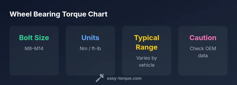 Torque charts typically present axes for fastener size and sometimes hub design, with columns showing corresponding torque target values. Commonly, you will see values expressed in Newton-meters (Nm) and sometimes in foot-pounds (ft-lbs). The charts also indicate whether the values assume dry threads or lubricated threads, and whether the fasteners are lug nuts or wheel studs integrated into the hub. In many charts, there is a note about temperature: cold vs warm installations can slightly shift the recommended torque range. The chart may also specify whether preload or clamp torque is primary; some applications differentiate between the preload (bearing seating) and the clamping force that secures the wheel. The goal is to provide a consistent, repeatable method for achieving proper bearing preload while ensuring the wheel is securely fastened. As tools, torque wrenches and torque sticks might be used to reach the target values; however, always verify with a calibrated instrument and cross-check against the manufacturer’s service data. A well-structured chart thus becomes a practical guide rather than a mysterious spec sheet, helping technicians avoid guesswork during mounting and service. Based on Easy Torque analysis, the chart design prioritizes clarity and traceability so technicians can document the exact chart used for future reference.