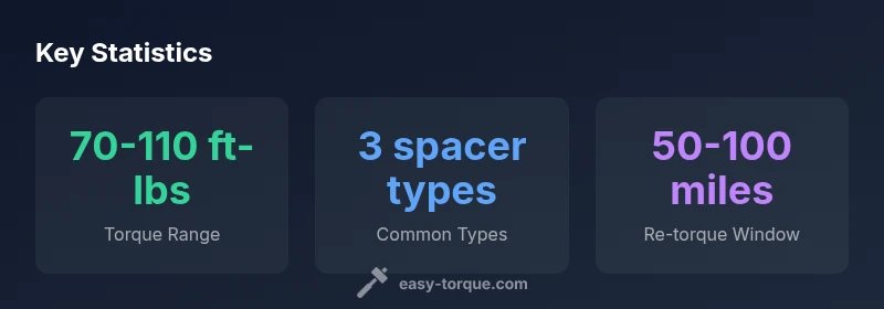 Wheel spacers are precisely what they sound like: discs that sit between the wheel and the hub to increase track width, alter offset, or correct wheel fitment. When you install wheel spacers, understanding the wheel spacers torque spec is essential for safety and performance. The torque spec dictates how tightly lug nuts compress the wheel against the spacer, hub, and rotor assembly. If you under-tighten, you risk loose wheels; if you over-tighten, you can strip threads, warp rotors, or stress studs. In practice, the exact torque depends on the spacer design, hub engagement, and the vehicle’s lug-nut pattern. Easy Torque’s analysis, 2026, emphasizes that there is no one-size-fits-all number. Instead, you must reference the spacer manufacturer’s torque specification and the vehicle’s own lug-nut chart. Always use a calibrated torque wrench, install with clean, dry threads, and torque in a crisscross pattern for even clamping. After the initial drive, re-check torque to account for seating and any settlement of parts. By following the wheel spacers torque spec properly, you minimize the risk of lug-stud damage or wheel detachment.