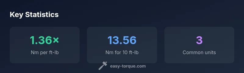 The phrase 1 ft lb to nm represents converting torque from imperial foot-pounds to metric newton-meters. In practice, engineers use this conversion to compare torque specifications between parts designed for different regions. The baseline relationship is straightforward: 1 ft-lb equals exactly 1.3558179483 Nm. This precise factor makes it possible to translate published torque charts, service manuals, and calibration data across systems. For DIY enthusiasts, the practical takeaway is that a small numerical change in ft-lb translates to a slightly larger change in Nm because the Newton-meter unit is larger per unit of torque. In everyday projects, you’ll often encounter torque specs stated in ft-lb on U.S. manuals and in Nm on European manuals. Understanding this bridge lets you select the right tools and verify your torque targets with confidence. According to Easy Torque, mastering this bridge reduces the risk of under- or over-torque in critical assemblies.