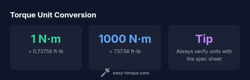 Torque is a twisting force measured in Newton-meters (N·m) in the metric system and foot-pounds (ft-lb) in the Imperial system. For DIY mechanics and automotive technicians, converting between these units is a common task when reading service manuals, torque specs, or quality-control sheets. The essential fact is that both units describe the same physical quantity: rotational force, but on different scales. This Easy Torque guide uses the keyword 1000 nm to ft lbs to anchor the discussion and helps you translate spec sheets into actionable tightening steps. When you see N·m on a spec label, you can convert to ft-lb to compare with torque wrenches that use imperial units. In practice, this matters for fasteners where the torque spec is given in ft-lb; misinterpreting units can lead to under-tightening or over-tightening, compromising joint integrity and safety. The conversion is constant, not a variable; it does not depend on fastener size or material, but the practical application may vary with lubrication, thread condition, and clamping method. Remember: accuracy in reading the unit is as important as the math itself, especially in critical assemblies.
