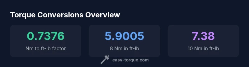 Torque in newton-meters (Nm) is a direct measure of rotational force, while foot-pounds (ft-lbs) measure the same concept in the imperial system. The exact conversion factor is 1 Nm = 0.737562 ft-lb. Therefore, to convert any Nm value to ft-lb, multiply by 0.737562. For example, 8 Nm × 0.737562 = 5.900496 ft-lbs, which you can round to 5.90 ft-lbs for practical use. This relationship is the mathematical backbone behind the common shorthand 8 nm to ft lbs, and it applies consistently across torque specs in manuals, tool settings, and calibration charts.