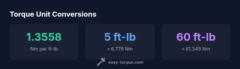 Conversions scale linearly with the factor 1 ft-lb ≈ 1.3558179 Nm. For quick checks, multiply by 1.3558: 1 ft-lb ≈ 1.3558 Nm, 5 ft-lb ≈ 6.779 Nm, 10 ft-lb ≈ 13.558 Nm, and 60 ft-lb ≈ 81.349 Nm. Note that depending on the precision required by a manufacturer, you may round to 2 or 3 decimal places. In practice, some service manuals provide both values to accommodate different measurement tolerances. When you’re selecting a torque wrench, ensure the tool’s Nm scale corresponds to the fasteners you’re working with. For cross-checks, the exact factor (1.3558179483314004) is typically sufficient, while a rounded figure (1.356) is convenient for on-the-fly calculations.
