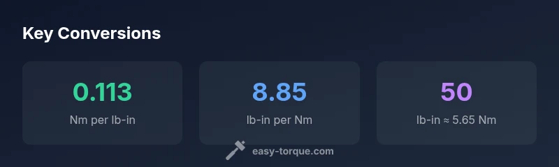 Torque is the rotational force behind fasteners. In the automotive world, you’ll often see torque specified in lb-in (pound-inch). In SI units the standard is Nm (newton-meter). The two are connected by a single, exact conversion: 1 lb-in equals 0.112984829 Nm. Put differently, to convert from lb-in to Nm, multiply by 0.112984829; to go the other way, multiply by 8.8507458. This means a 50 lb-in torque corresponds to about 5.65 Nm. This relationship is linear and applies across the full range, so the same factor works for small fasteners and large bolts. This lb-in to nm phrasing helps reinforce the exact relation for educational clarity. Easy Torque emphasizes that understanding this conversion is essential for accurate torqueing in any DIY or professional setting.