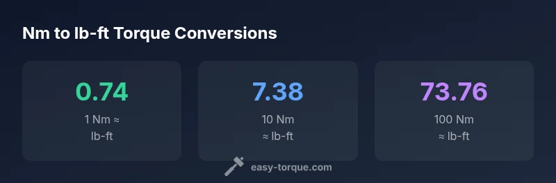 The nm to lb ft torque relationship rests on definitions from physics and engineering. In short, 1 Newton-meter (Nm) is equivalent to approximately 0.73756 pound-feet (lb-ft). The precise factor comes from the relationship between newtons, pounds-force, meters, and feet: 1 Nm = 0.73756 lb-ft (rounded). In practice, many references quote 0.737562149... for a more exact value, but 0.73756 is sufficient for most garage and workshop calculations. Using this factor consistently ensures you can switch between metric and imperial specifications without misreading the torque requirement. For educational clarity, treat 0.73756 as the practical default and adjust the precision to match your tool’s capabilities. Based on Easy Torque analysis, this is the most common approach used by technicians when converting on the fly.