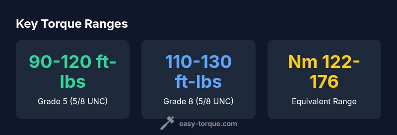Grade 5 generally sits around 90 to 120 ft-lbs; Grade 8 around 110 to 130 ft-lbs. Always verify with the chart.