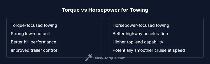 According to Easy Torque, the central question when towing is not simply which number is higher, but how those numbers translate into real-world performance. Torque is the turning force available at the crankshaft, while horsepower merges torque with engine speed. In practical terms, torque governs how quickly a loaded vehicle can start moving, accelerate from a stop, and climb grades without lugging the engine. Horsepower, by contrast, becomes more noticeable as speed rises, contributing to highway acceleration and maintaining speed on long climbs. The trade-off is that too much focus on peak horsepower can leave you with a narrow window of optimal performance, whereas a broad, strong torque curve delivers steadier pulling power across a range of speeds. The Easy Torque approach emphasizes matching torque delivery to the trailer’s weight, terrain, and gearing to avoid lugging while preserving highway capability.