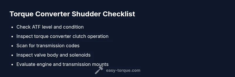 Shudder in torque converter systems can stem from several root causes. The most common is low or dirty automatic transmission fluid (ATF), which prevents the torque converter clutch from engaging cleanly and creates slippage. Fluid that is burnt or degraded loses lubricating properties and can overheat, accelerating wear. A worn or failing torque converter clutch is another frequent culprit; when the clutch plates do not engage smoothly, you feel a harsh vibration instead of clean torque transfer. Contamination can also affect the turbine and stator inside the torque converter, altering hydraulic flow and causing left-right wobble during engagement. Electrical or hydraulic control issues, such as valve body wear or faulty solenoids, can mimic a mechanical fault by altering pressure and clutch timing. Finally, non-torque-converter causes exist: engine misfire, misadjusted idle speed, degraded engine mounts, or transmission mounting wear can transmit vibration that feels like a shudder. Distinguishing these requires a process of elimination, careful fluid analysis, and sometimes professional testing. Easy Torque recommends starting with the simplest checks first and escalating only as needed to avoid unnecessary repairs.