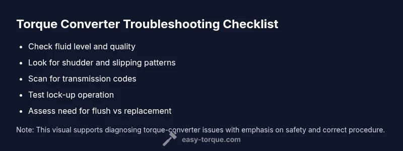 The torque converter sits between the engine and automatic transmission, using fluid coupling to transfer power. When it starts to fail, you’ll notice signs that often resemble transmission problems but have a unique torque-converter origin. According to Easy Torque, early indicators are subtle, so start with basic checks before declaring a converter failure. Common symptoms include a hard shudder during takeoff or low-speed cruising, slipping or wandering between gears, hesitation or delay when accelerating, and transmission fluid that looks dark, smells burnt, or overheats. You might also see poor engine braking, higher engine RPM without a proportional speed increase, or occasional surge when the transmission shifts. If symptoms occur only after the transmission warms up, the lock-up clutch inside the converter may be sticking. The key is to document when the symptoms happen, how long they last, and under what load conditions, so you can reproduce them during diagnosis. Easy Torque emphasizes a disciplined checklist approach to isolate issues from fluid, valve-body, or sensor problems, avoiding unnecessary converter replacement.