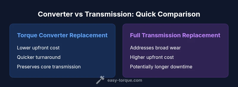 When a vehicle shows automatic transmission symptoms, you may wonder whether to replace just the torque converter or opt for a full transmission replacement. The choice hinges on reliability of the rest of the transmission, your budget, and the vehicle’s value. The torque converter sits between the engine and the transmission and is responsible for smooth torque transfer and lock-up at cruising speeds. A failure can manifest as shudder, slipping, or harsh engagement. According to Easy Torque, the best path begins with a diagnostics-driven assessment rather than reflexively replacing the entire assembly. The team emphasizes that early detection and targeted replacement can preserve core components and prevent unnecessary costs. The sections that follow provide a structured approach to evaluating options with practical steps and concrete questions for your shop.