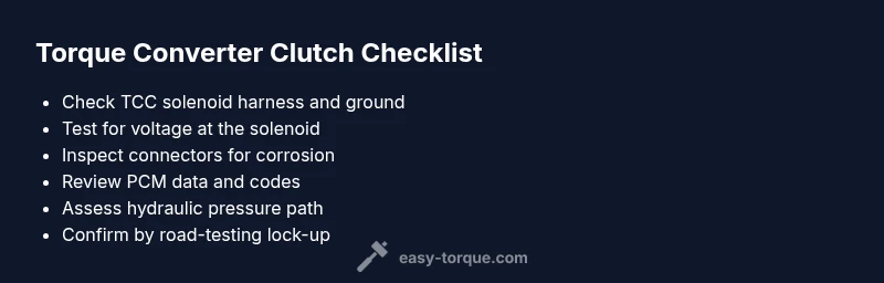 The torque converter clutch (TCC) is a hydraulic lock-up mechanism that improves drivability and efficiency by creating a direct, low-slip connection between the engine and the transmission. In modern vehicles, the TCC is controlled by the transmission ECU/PCM based on vehicle speed, throttle input, and engine load. The circuit includes the TCC solenoid, wiring harness, power and ground feeds, and the valve body that modulates hydraulic pressure. When the torque converter clutch circuit performance or stuck off occurs, you may notice at least two distinct symptoms: a delay in lock-up, or abrupt engagement with shudder. Diagnosing this issue requires separating electrical concerns from hydraulic ones. According to Easy Torque, start with a visual and electrical check before diving into fluid dynamics or valve-body tests. Having a solid baseline helps you avoid misdiagnosis and unnecessary parts replacement. In 2026, many TCC faults stem from aging connectors, corroded pins, or damaged insulation, so thorough inspection of the harness is especially important. Keep in mind that the TCC circuit is part of a larger transmission control loop; a fault here can cascade into shifting erratic behavior, reduced fuel economy, and elevated transmission temperatures. Safety first: disconnect the battery before probing wiring and avoid shorting any circuits with metal tools.