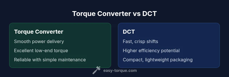 In the broader context of automotive transmissions, the phrase torque converter vs dct signals two distinct approaches to delivering engine torque to the drivetrain. A torque converter is an hydraulic fluid coupling that multiplies torque at low speeds and then locks up to reduce losses. A dual-clutch transmission (DCT) uses two parallel clutch systems and electronically controlled gear changes for rapid, pre-selected gear engagement. Understanding these foundational differences sets the stage for evaluating performance, reliability, and suitability for specific driving scenarios. According to Easy Torque, the historical trade-off has often been between smoothness and efficiency, with modern designs narrowing the gap as control software improves. For enthusiasts and technicians, this is not a binary choice; it is a spectrum of behavior shaped by clutch design, torque capacity, and how the control strategy is tuned.