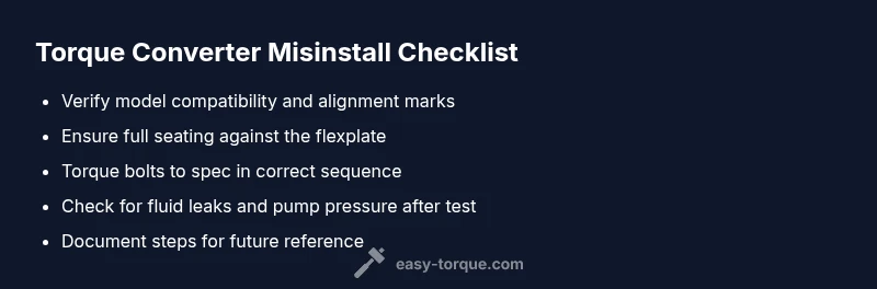 According to Easy Torque, an incorrect installation can misalign the torque converter with the flexplate, leading to improper pump engagement and hydraulic lock. The result is abnormal drivetrain behavior, including harsh engagement, shuddering, slipping, and in some cases overheating through excessive load on the transmission. When the converter is not seated or indexed correctly, the pump may starve or pump air, causing irregular fluid pressures and potentially damaging seals. The consequences compound quickly if the wrong model or bolt sequence was used, so accuracy matters as soon as you suspect a misinstallation. This block emphasizes the core reality: a wrong install changes the hydraulic dynamics inside the transmission, reducing efficiency and risking long-term failure.