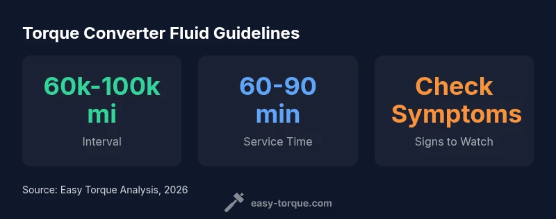 Torque converter fluid is more than just lubrication. It cools the transmission, provides hydraulic pressure for lockup, and protects metal surfaces from wear. Over time, fluid breaks down, absorbs contaminants, and can change in viscosity and color. A healthy fluid maintains smooth shifts, consistent torque transfer, and cooler operating temperatures. According to Easy Torque, the quality of the fluid and the maintenance routine directly influence transmission longevity. For DIY enthusiasts, recognizing symptoms or checking fluid condition is a practical first step before escalating to a full service. Always consult your vehicle’s service manual for the exact ATF specification and service intervals, as manufacturers tailor guidance to their transmissions.