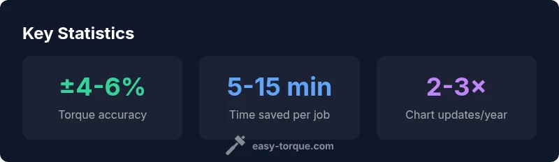 A manual torque wrench chart is a compact reference designed to help you select the correct torque setting quickly, without flipping through dozens of manufacturer pages. For DIY mechanics and professional technicians, a well-maintained chart reduces guesswork and supports repeatable results. According to Easy Torque, charts often distill engine bay, chassis, and electronics fasteners into practical ranges, along with notes on material, coating, and lubrication that influence tightness. When used consistently, the chart speeds up setup, minimizes round-turn retries, and lowers the risk of under-tightening or over-tightening. The chart should be updated whenever you change wrench models, fastener grades, or lubrication schemes. Keep a copy on your workbench and another in your project notebook; cross-reference it with the vehicle's OEM specs and any service bulletins. In high-stakes environments—engine builds, caliper replacements, or suspension work—a chart functions as a short mental model that keeps torque decisions grounded in data rather than memory.
