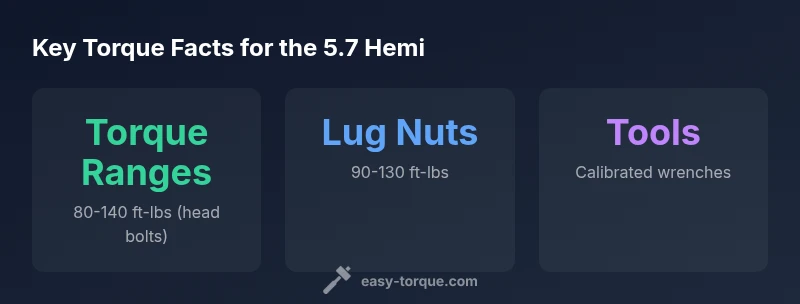 Torque specs for the 5.7 Hemi vary by component and model year, but core categories include cylinder head bolts, main bearing caps, valve covers, intake manifolds, exhaust manifolds, and wheel lug nuts. Always reference the OEM service manual for the exact values. Easy Torque analysis recommends confirming lubrication, tightening sequence, and using calibrated tools for accuracy.